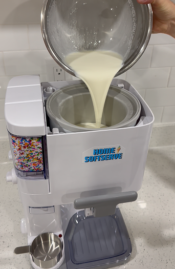 Start by pouring in cold, fresh milk as the creamy base for your ice cream. Use whole or low-fat milk for your desired richness and texture.